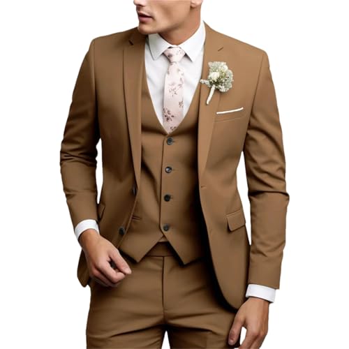 3-teiliger Anzug für Herren, schmal, Smoking, Revers, formelle Hochzeit, Blazer, Weste, Hose, Anzug-Set, Braun, 3 Stück, 3XL